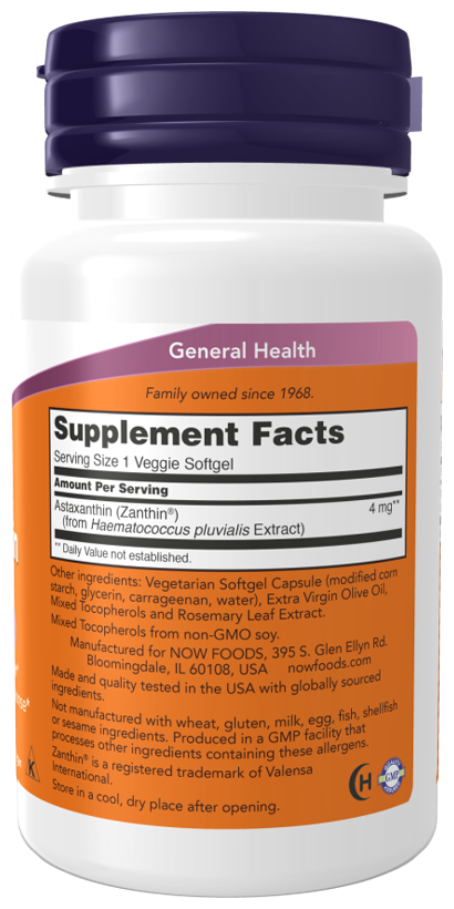 Астаксантин - это природный каротиноид, который благодаря своей уникальной структуре играет важную роль в защите клеток от свободных радикалов и здоровых реакциях иммунной системы.Now Астаксантин получен из микроводорослей Haematococcus pluvialis, не содержащих ГМО.