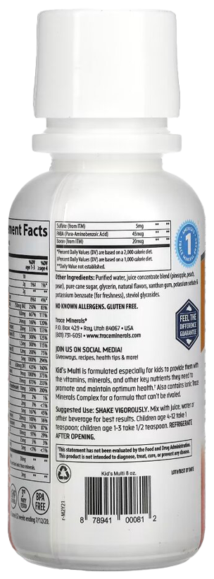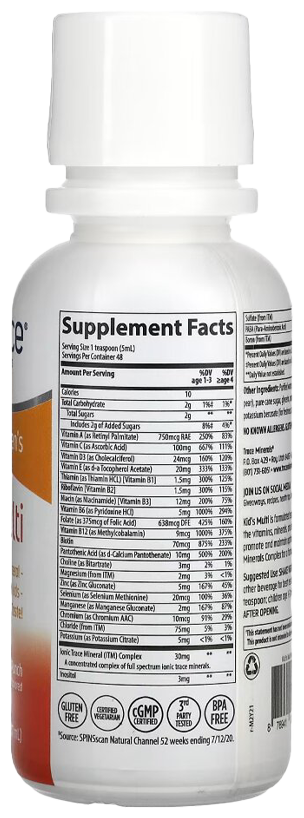 Мультивитамины для детей - это добавка, разработанная специально для того, чтобы обеспечить детский организм витаминами, минералами и другими важными питательными веществами, необходимыми для поддержания здоровья. Также содержит более 72 сбалансированных ионные микроэлементы от ConcenTrace.