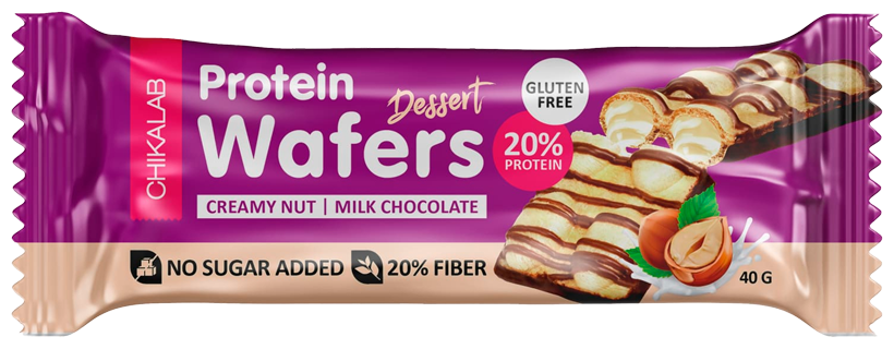 Chikalab Protein Wafers Dessert - двойная вафля с нежной сливочной начинкой, дроблёным фундуком и натуральным молочным шоколадом. Хрустящие подушечки без глютена и добавленного сахара содержат 8 г белка в каждой порции.