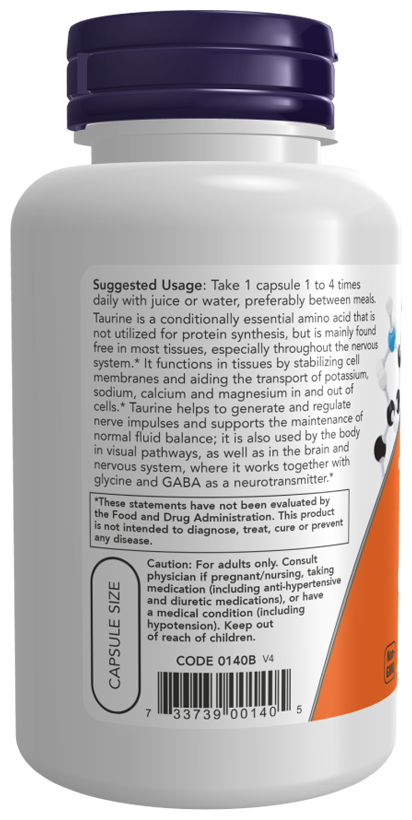 Таурин - это условно незаменимая аминокислота, которая не используется для синтеза белка, но в основном содержится в свободном виде в большинстве тканей, особенно в нервной системе. Он функционирует в тканях, стабилизируя клеточные мембраны и помогая транспортировке калия, натрия, кальция и магния в клетки и из клеток. Таурин помогает генерировать и регулировать нервные импульсы и поддерживает поддержание нормального баланса жидкости; он также используется организмом в зрительных путях, а также в мозге и нервной системе, где он работает вместе с глицином и ГАМК в качестве нейротрансмиттера.